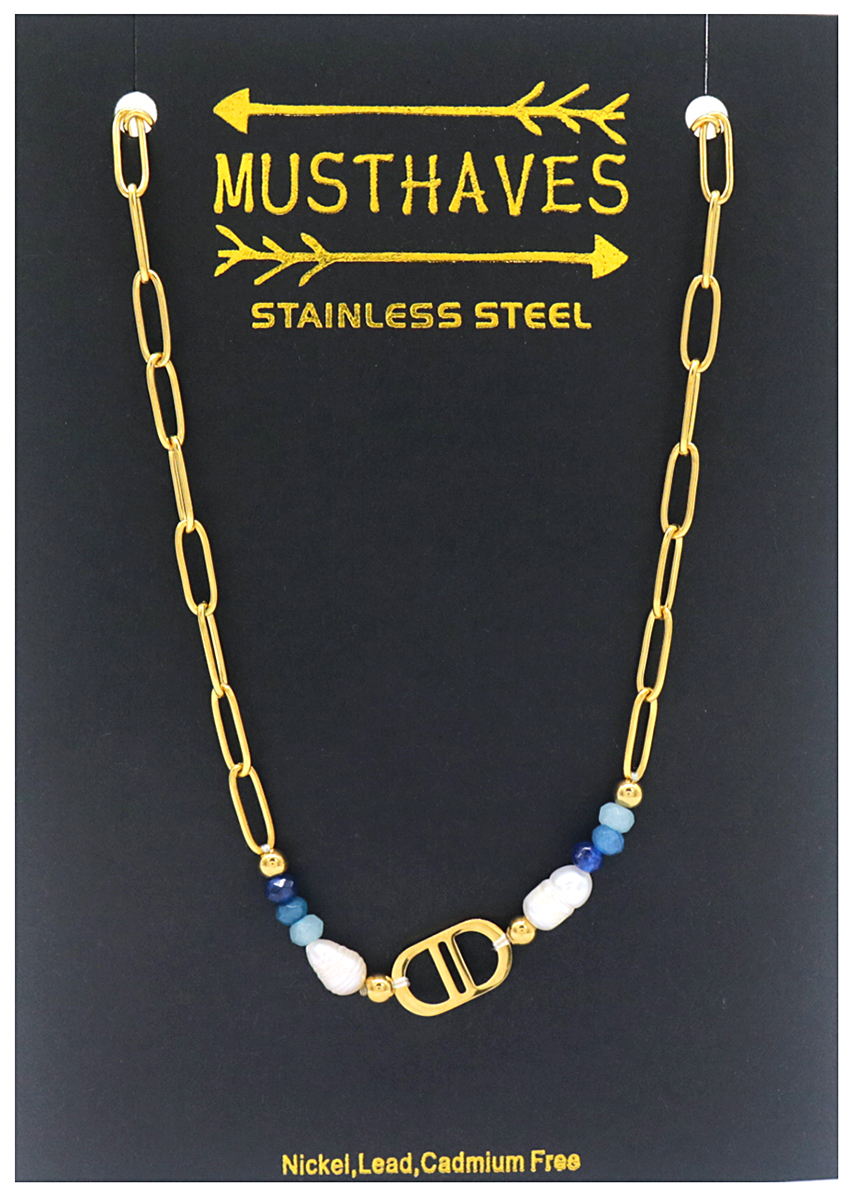 B-D2.1 N221-307 S. Steel Necklace Freshwater Pearl Gold-Blue 40-45cm