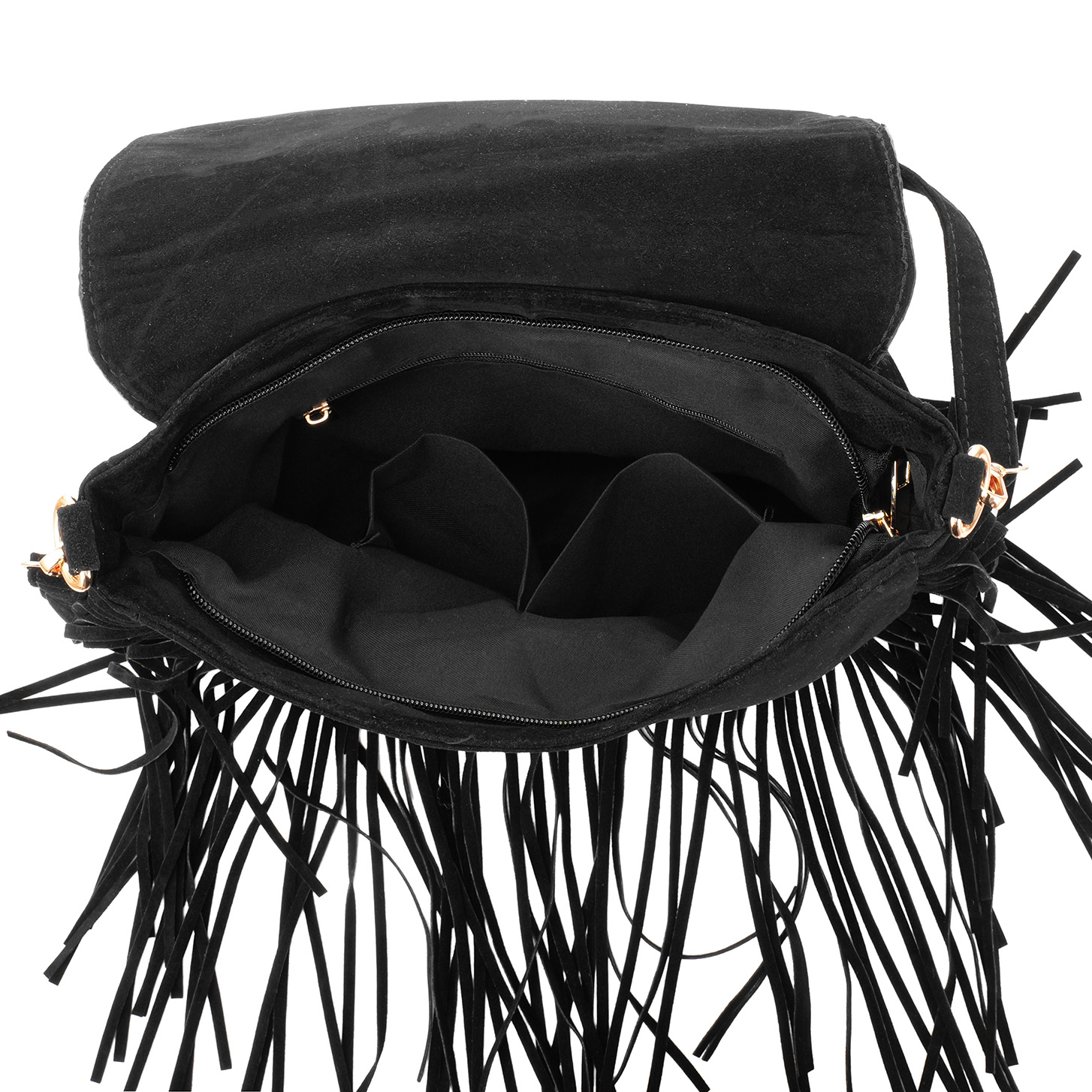 Un bolso de uso diario elegante y compacto en PU negro duradero, rematado con flecos modernos y tachuelas de metal. Este ligero bolso cruzado/de hombro, que mide 30 x 27 cm, combina un toque moderno con una organización práctica, perfecto para llevarlo del día a la noche.