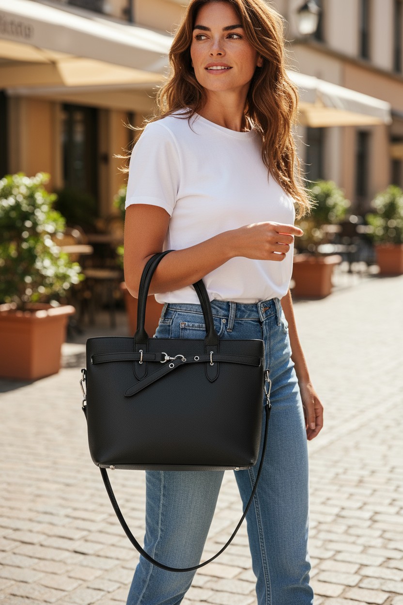 Con asas cómodas y una correa para el hombro ajustable, este bolso ofrece múltiples opciones de transporte para su comodidad. La construcción liviana garantiza la facilidad de uso, mientras que el elegante acabado negro agrega un toque de elegancia a cualquier atuendo.